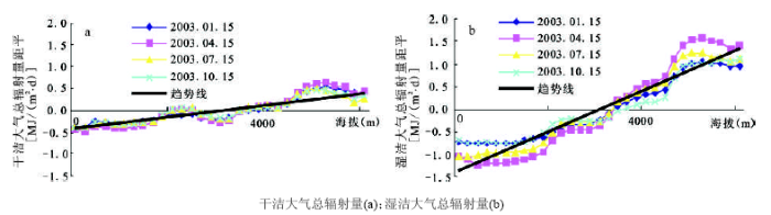 图2 30°N水平面干/湿洁大气日总辐射量随海拔变化趋势