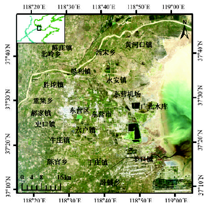 现代黄河三角洲是1855年以来,黄河冲淤作用形成的冲积扇,是最年轻的陆地。研究区位于莱州湾的西岸(图1),包括垦利县、东营市、东营区及周边乡镇等。该区域地形平坦,海拔高度多小于6 m,平均坡降平缓,为1/10 000左右。研究区范围为118°~119°E,37°~38°N,覆盖面积约70 km×70 km。研究区内石油、天然气、卤水和地热资源等资源丰富。研究区植被茂密,湿地广泛分布,这使得传统测量中观测点的设置、维护和观测相对困难。
