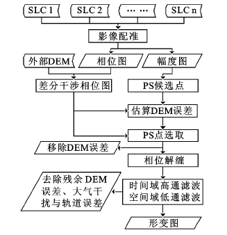 利用Hooper提出的新的PS算法对数据进行处理,主要步骤如图2所示:首先,选取主影像,裁剪研究区,并将主影像与辅影像依次配准并干涉处理,去除地形相位影响,得到9景差分干涉相位图;其次,确定PS点,将幅度分布指数设定为阈值0.4筛选PS候选点,并对空间相关误差和空间非相关视角误差进行估计,通过估计PS候选点的相位稳定性确定最终的PS点;然后去除估计的误差并利用三维相位解缠方法进行相位解缠;最后,在时间域上做高通滤波,在空间域上做低通滤波,去除残余DEM误差、大气干扰与轨道误差影响,获得研究区的形变相位。