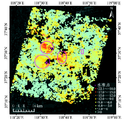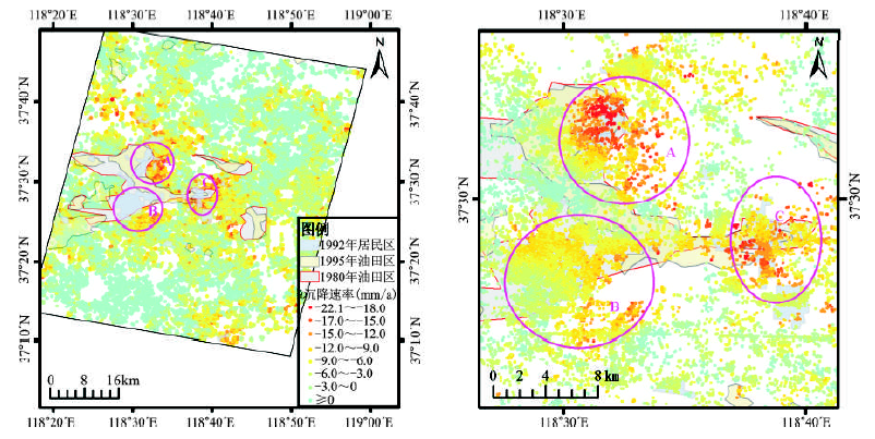 在图3中,PS点在居民区、道路、水库堤坝等处分布较密,且明显沿道路和堤坝呈线状分布,证明实验选取的PS点的稳定性和可靠性。此外,由于在植被茂密地区和东部湿地分布区存在人工建筑、油井和裸地等,也都顺利提取到PS点。研究区内地面沉降广泛分布(见图3),重点选取A、B、C三个沉降量相对较大的椭圆形区域进行讨论,其中A区域为胜利采油厂及其周边地区,提取到的2 439个PS点的地面沉降速率的平均值为10.1 mm/a,区域内有大量的PS点的沉降速率在(6~15)mm/a,且有较多PS点的沉降速率大于15 mm/a,最大沉降速率达到22.0 mm/a。B区域位于东营市西城区, 提取到的5 417个PS点的沉降速率的平均值为7.1 mm/a,B区域内有较多PS点的沉降速率分布在9 mm/a左右,只有较少PS点的沉降速率大于12 mm/a,其中,耿井水库南部油井附近监测到的9个PS点的沉降速率的平均值为14.7 mm/a,最大沉降速率达到16.3 mm/a。C是东营市东城区,提取到的1 156个PS点的沉降速率的平均值为7.4 mm/a,其中有较多PS点的沉降速率分布在12 mm/a左右,只有很少PS的沉降速率大于15 mm/a,最大沉降速率达到17.7 mm/a。此外,东营市垦利县郝家镇胜利油田稠油厂附近油库分布广泛,油库附近各PS点的沉降速率的平均值为6.5 mm/a;胜坨镇最大沉降速率为12.8 mm/a;卧铺乡最大沉降速率为17.2 mm/a;黄河口镇最大沉降速率达到15.6 mm/a;羊口镇清河采油厂附近监测到最大沉降速率达到11.5 mm/a;羊口镇地下卤水储量丰富,盐场广泛分布,盐场中提取到的几个PS点中沉降速率最大为16.8 mm/a。另外,沿海地区地面沉降普遍存在,广北水库附近及其以东地区平均地面沉降速率约为4.4 mm/a。