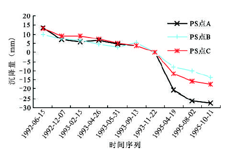 在A、B、C三个区域,分别选取一个能够反映该区域形变特征的沉降量比较大的PS点,依次标注字母A、B、C,并给出各个时间段内PS点的沉降量情况。其中所有沉降量都是相对1993年11月22日获取的主图像的垂直方向的形变量,正数表示该时间段的地面相对于主影像上升,负数表示该时间段地面相对主影像下沉(单位mm)。图5中依次是A、B、C三个区域中选取的PS点的时间序列沉降情况。其中,A区域PS点的沉降量范围是13.3~-27.7 mm;B区域PS点的沉降量范围是10.0~-13.6 mm;C区域PS点的沉降量范围是13.2~-17.4 mm。