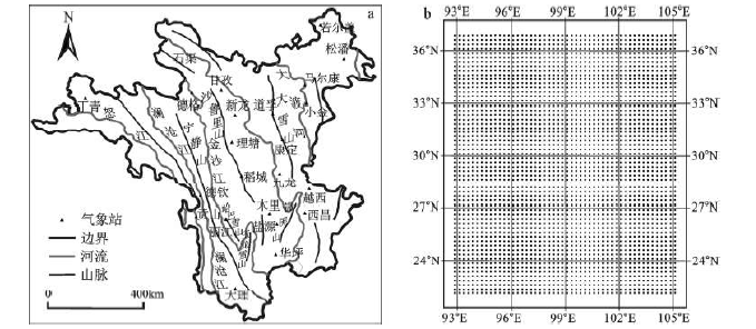 横断山区是世界上最典型的纵向山脉分布区之一,“通道-阻隔”作用非常明显[15,16],即区内东西向阻隔作用的绝对性和南北通道作用的相对性,气候上深受西南季风和西风环流交替影响。以往针对TRMM数据的检验多在海洋或地势相对较平坦的区域[3,11],而对下垫面较复杂的区域检验不足,本文利用相关系数法、散点斜率法和地统计方法对横断山区的TRMM 3B43数据精度进行分析验证 [16~19]。