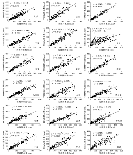 TRMM 3B43与气象台站观测数据决定系数R2=0.862 5,K=0.662。 整体而言,TRMM 3B43数据的降水量比实测值偏大。从检验的结果可知,TRMM 3B43数据在整体上与实测数据有一致的分布规律和变化趋势,但是实测数据是单点数据,而TRMM数据是格网数据,相关性分析容易掩盖单点数据与对应格网的TRMM 3B43数据之间的差异。事实上降水受地形、地势、海拔、大气环流、海陆位置等因素影响,具有时空不连续性与高度非线性特征,对部分气象站点进行回归检验(图2)。