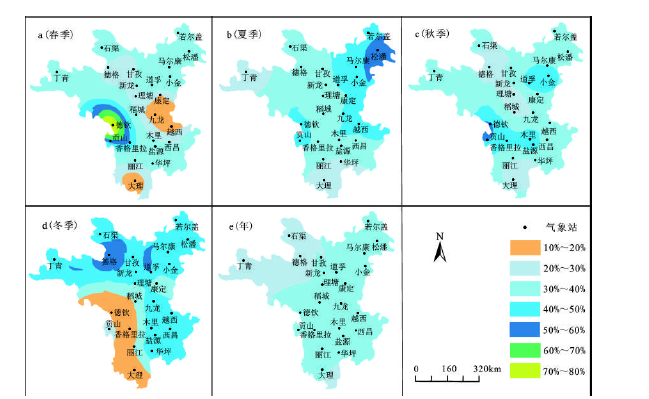 研究区地形复杂多变,立体气候显著。横断山西北部自西向东分布着大雪山、大渡河、邛崃山;香格里拉三江并流区自西往东南北纵向排列着高黎贡山、怒山-碧罗雪山、云岭、香格里拉大雪山和沙鲁里山,怒江、澜沧江、金沙江穿行在这几座大山之中。纵向岭谷地貌形成明显的东西阻隔,南北贯通作用,对西南季风的空间分布会产生明显的影响,而西南季风是影响横断山区降水最关键的因素,春季和夏季降水量时空分布表现出空间不连续特征即是岭谷地形作用的体现,秋季和冬季降水等值区基本连续分布,地形的影响并不明显。