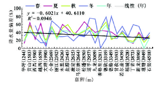 1) 气象站实测与TRMM 3B43降水量之间呈现出较高的相关性(R=0.928;P<0.01);与TRMM 3B43数据决定系数R2=0.862 5,K=0.662,说明TRMM 3B43 数据的降水量比实测值偏大。春、夏、秋和冬季误差分别为32.0%,38.3%,36.8% 和34.9%。