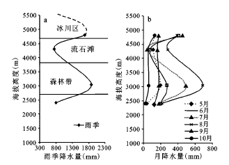 2009年5~10月玉龙雪山东坡海拔为2 400、3 046、4 300、4 800 m处的雨季降水总量依次为788.4、1 884.3、735.3、1 680.7 mm,表明降水量随海拔高度发生了明显变化[20]。如图5a所示,玉龙雪山东坡不同海拔处5~10月各月降水量随海拔的升高均呈现“增加-减少-增加”的过程;在3 000 和4 900 m 分别出现2个降水量较多的地带。贡嘎山东坡海拔1 600~3 800 m 高度为第一大降水带,5 500 m左右为第二大降水带[21]。李吉均和苏珍[6]研究认为,一般而言,山地降水量是随海拔升高而不断增加,到一定高度后又减少,然后从非冰川区过渡到冰川区降水量又有所增加。 但由于山地所处地理位置、走向、地形等因素的影响,各山地的最大降水带高度不一致。