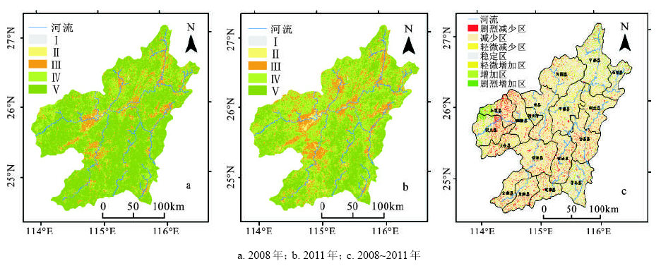 计算2008、2011年研究区平均植被覆盖度分别为75.40%,68.10%,植被覆盖总体较好,但2008年植被质量明显优于2011年,植被覆盖呈退化趋势。由图2a和b及表2可知,2008和2011年研究区植被覆盖度等级发生较明显变化。高植被覆盖面积减少占总面积的26.77%;植被覆盖低值区域(等级Ⅰ和等级Ⅱ)面积增加,增加面积占该区总面积的1.49%。将图2a、b与赣南市县界行政区划图层叠加,可以看出:中度及中度以下植被覆盖区域多以城市建城区为中心向外围扩散,而高植被覆盖区域集中在赣州周围山区;另外,信丰、南康、兴国、于都、瑞金、宁都、龙南都存在大面积的集中连片的中度及中度以下植被覆盖区,该区域红壤集中连片,由花岗岩风化物发育形成,整个土层中夹有多量石英砂和砾石,质地粗糙,漏水漏肥,为全国水土流失严重县。由图1c可见,近3 a该研究区植被覆盖变化以减少为主,其次为稳定区域。植被退化呈现典型的空间集聚性,主要分布在赣州南部和赣州中西部两大区域;上犹、崇义西部山区植被有较大恢复,该区域相对海拔较高,土壤类型以黄壤和黄棕壤为主,利于植被生长和恢复。由表2可知,宁都、余都、兴国3个典型水土流失县植被覆盖总体趋向好转,其中宁都植被改善尤为明显;瑞金、龙南、南康、信丰植被覆盖呈进一步恶化趋势,其中龙南植被退化在这几个县中最为严重,龙南离子型重稀土的储量和质量居世界之首,近几年稀土盗采和无序开发直接导致大量植被砍伐,生态环境破坏严重,另外,大量山地被开垦成果园也是植被覆盖减少的重要原因。