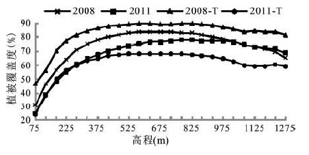 图2 2008~2011年研究区植被覆盖度随高程变化