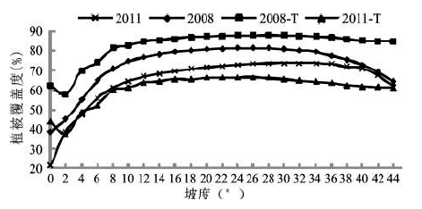 研究区域山体坡度<45°所占面积较小。因此,以0~45°坡度为研究范围,将坡度以2°为间距,采用同上方法,得到研究区植被覆盖及退化随坡度的变化特征(图4)。南方丘陵山区降雨频繁,随着坡度的增加,水土流失增强,会导致土壤有机质含量降低,不利于植被生长[17];同时,人类活动也趋向于集中在坡度较低区域。从图4可以看出,15°以下,人类活动对植被覆盖起主导作用,随着坡度升高,植被覆盖急剧增加;15~35°植被生长状况最为良好,该区域以林地为主,受人为的因素较小,有机质积累较多。而35°以上,降雨对土壤有机质流失的作用开始显现,植被覆盖随着坡度增加而减少。对坡度和植被覆盖度数值的相关性进行计算,得到2008、2011年相关系数分别为0.49和0.66,具有一定的弱正相关性。退化区域植被覆盖在2°附近均降到最低,然后逐渐上升至15°坡度开始逐渐平稳下降。2°附近水体、城镇集中出现[18],导致退化区域覆盖度曲线在2°出现最低点。