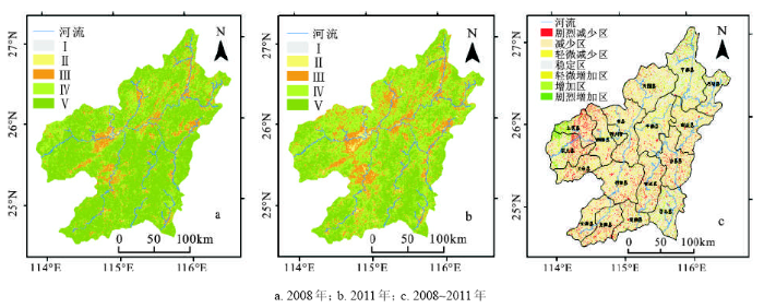 1) 该区域2008、2011年平均植被覆盖度分别为75.40%,68.10%,尽管整体情况良好,但有退化趋势,高植被覆盖面积大幅减少;植被退化呈现典型的空间集聚性,主要分布在赣州南部和赣州中西部两大区域,宁都、余都、兴国三个典型水土流失县植被覆盖总体趋向好转,而瑞金、龙南、南康、信丰植被覆盖呈进一步恶化趋势;