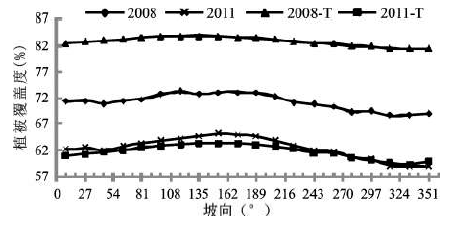 将坡向以18°为间距,采用同上方法,得到该区域植被覆盖及退化随坡向的变化特征(图6)。由于不同坡向决定着光照等自然条件,坡向对温度、湿度有较大影响,进而直接影响植被生长。可以看出,从时间尺度上,2008与2011年植被覆盖随坡向变化趋势基本一致,各坡向范围内植被覆盖度均呈减少趋势。总体来看,植被在阳坡(坡向范围为:135~225°)生长状况优于阴坡(坡向范围为:315~360°、0~45°)。这主要与温度和降水的差异有关,阳坡比阴坡接受更多的太阳辐射,温度状况优于阴坡。此外,该研究区处于东南亚季风地区,夏半年盛行偏南风,为单一盛行风向,受地形阻挡和焚风效应的影响,阳坡的降水量也多于阴坡,从而有利于植被的生长。对坡向和植被覆盖度数值的相关性进行计算,得到2008、2011年植被覆盖度与坡向相关系数分别为-0.82和-0.60,具有一定的负相关性。
