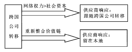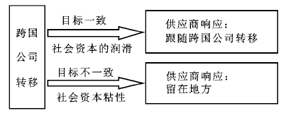 在权力对等关系下,跨国公司与地方供应商之间的相互依赖性很高,而且跨国公司在专用性资产上所做的投资也较高,跨国公司不拥有足够的网络主控权来强制原有成员一同转移,这时候起作用的主要是地方联系。如果跨国公司单独转移,其沉没成本很高,这时候社会资本是粘性因素,对地方供应商来说也是一样。在这种情况下,跨国公司和供应商是否一起转移,取决于它们转移决策的目标是否一致。如果目标一致,则发挥作用的主要是社会资本,并且社会资本的作用会发生改变,由原来的粘性因素变为促进转移的润滑剂,促使跨国公司与供应商一起转移(图1)。但是,这种对等依赖关系比较少见,大多数情况下跨国公司和供应商的关系都是不对等依赖关系类型的。因此,供应商之间的抱团合作非常重要。