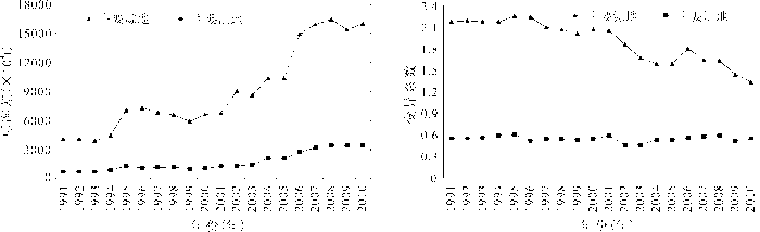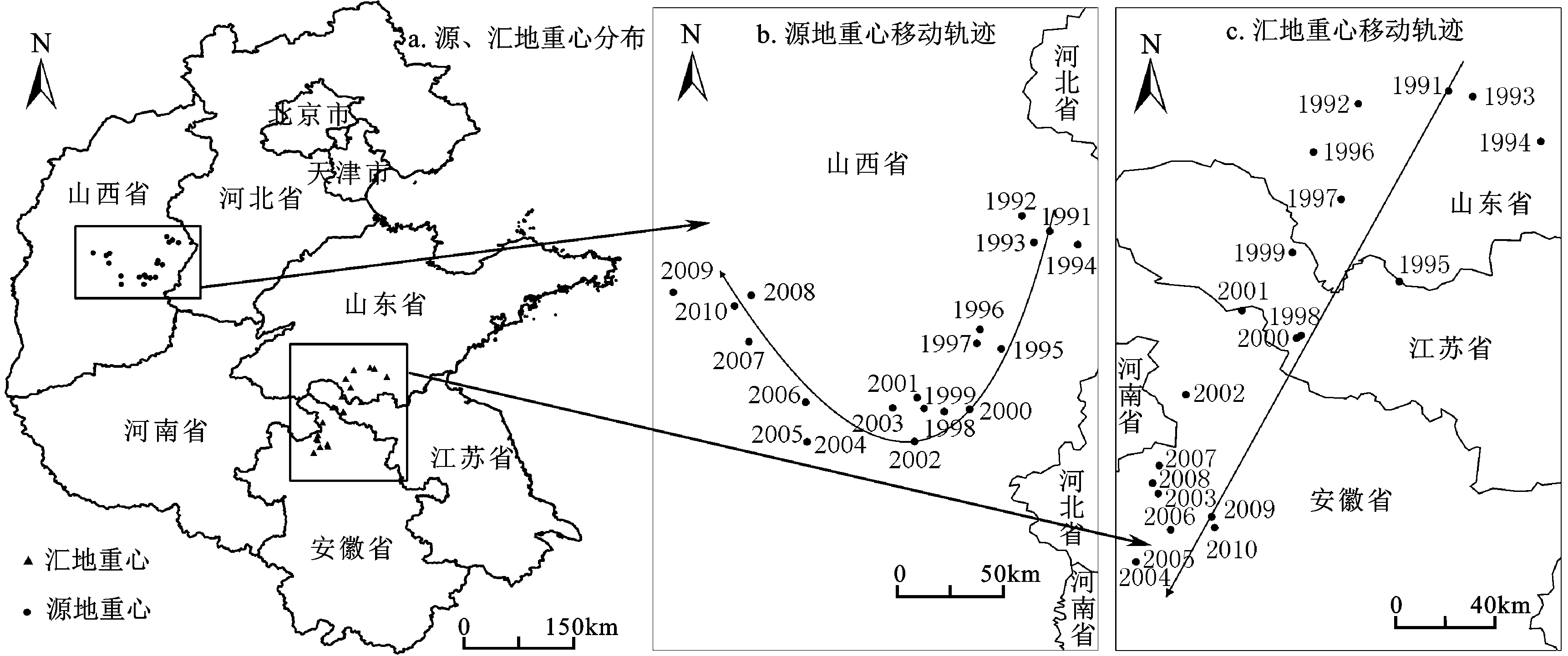 从纬度方向上看(图2b),中国煤炭源、汇地重心移动过程都呈现出明显的波动性,源地重心经历了由北向南再向北的转移过程,汇地重心表现为波动中南移的趋势。这表明,中国煤炭资源的开发过程先后经历了由北向南再向北的变化。具体来说,随着南部如安徽等地煤炭资源的开发以及黑龙江等东北地区产销量占全国比重的相对降低,煤炭源地重心在1991~2002年间呈现出向南转移的趋势;而之后陕西、宁夏先后成为全国煤炭基地,产销量占全国的比重明显提高,以及河北、天津煤炭港口的建设,导致全国煤炭源地重心在2002~2010年间呈现向北转移的态势。汇地重心南向移动与其西向移动的影响因素是一致的,即研究期国家经济发展的总体方向为向南转移,煤炭的需求空间也随之发生移动。