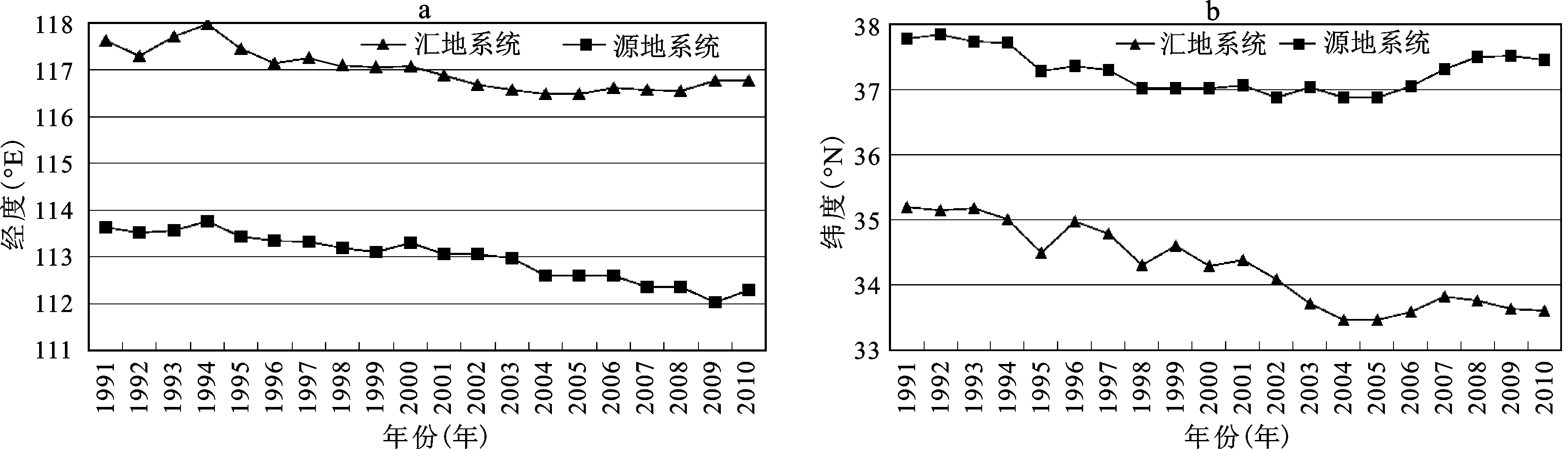 从经度方向上看(图2a),中国煤炭源、汇地重心移动轨迹呈现较为温和的移动特征,没有出现短暂而又快速的移动期,两者都呈现缓慢地向西移动的趋势,表明1991~2010年西部地区煤炭资源调拨量明显变大。西部地区煤炭资源的开发,尤其是陕西、宁夏相继成为国家煤炭基地,以及晋、陕、蒙、宁、黔煤炭铁路外运通道及北方煤炭港口建设等,成为煤炭源地重心西移的主要推手。而汇地重心西向移动则主要是煤炭资源需求空间转移的结果,即研究时段内,随着西部大开发和中部崛起等国家经济战略的实施,中西部地区经济得到快速发展,其能源需求也在逐步增大,从而导致煤炭汇地重心西向的转移。