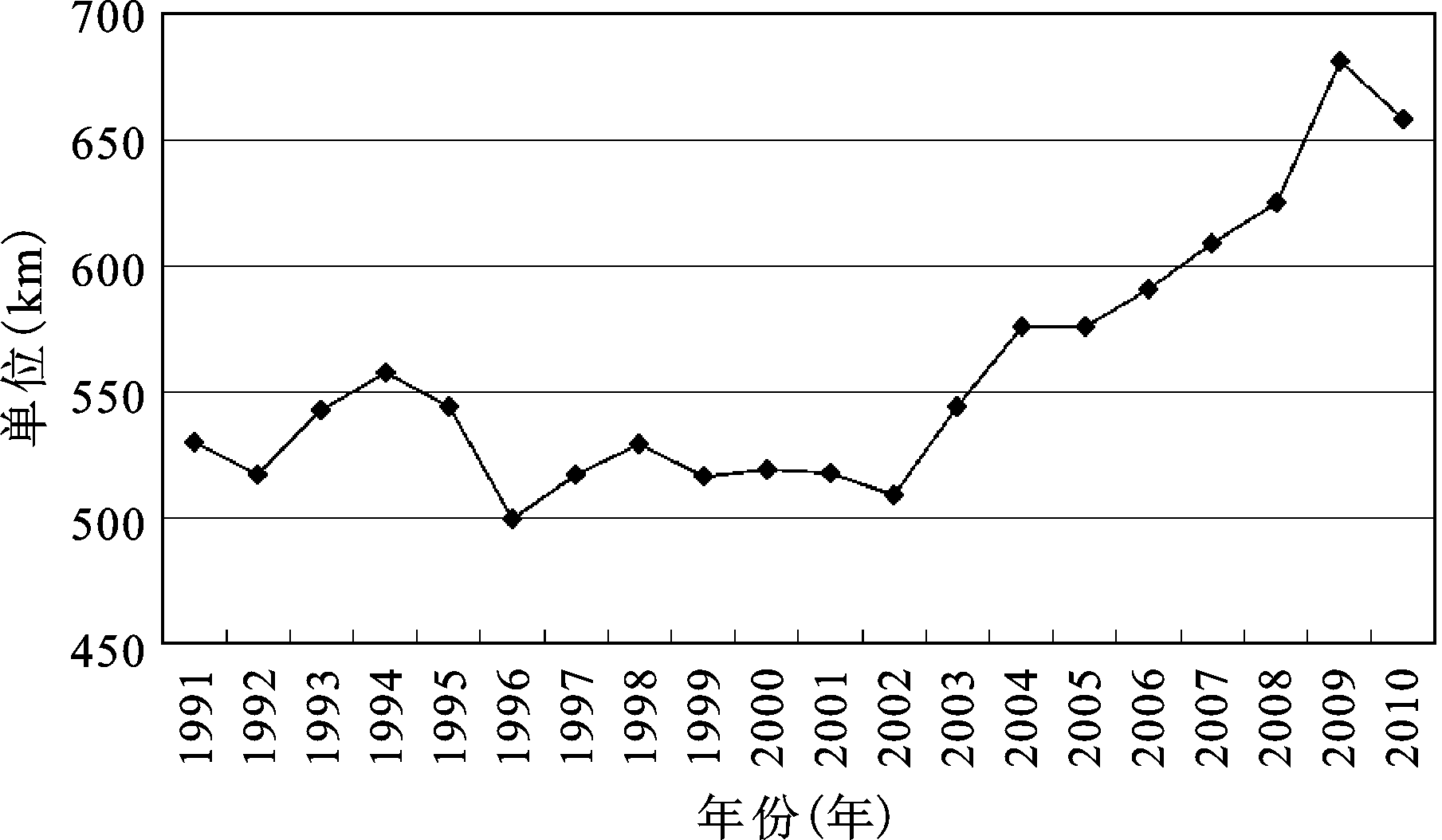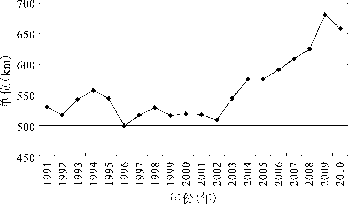揭示源、汇地空间分离的程度及其发展趋势(图3)。如图3所示,源、汇地重心空间距离变化总体上呈2个发展阶段:1991~2002年,源、汇地重心空间距离基本上在500~550km之间徘徊;从2002年起,源、汇地重心空间距离发生突变,距离持续增大,分离趋势明显加快,由2002年的508.79 km上升到最高2009年的681.65 km,7 a增加了172.86 km,年均增长4.27%,表明中国煤炭主要生产输出地与消费输入地间的空间分离趋势逐渐变大。究其原因,可从煤炭源、汇地重心轨迹空间移动(图1)做出初步解释,即1991~2002年源、汇地重心总体空间位移方向都为东北-西南方向,且斜率大致相当,此阶段源地重心轨迹趋势线和汇地重心轨迹趋势线可以看作近似平行关系,所以源、汇地重心空间距离在略微波动中基本保持较为稳定的空间间距。而2002~2010年,源地重心空间位移方向发生转折性改变,由东北-西南方向转变为东南-西北方向,而汇地重心空间位移方向仍为东北-西南方向,两者间的距离在南北方向上持续拉大,由此得出主要煤炭生产输出中心的北移和消费输入中心的南移是造成中国煤炭源地中心和汇地中心空间分离的主因。