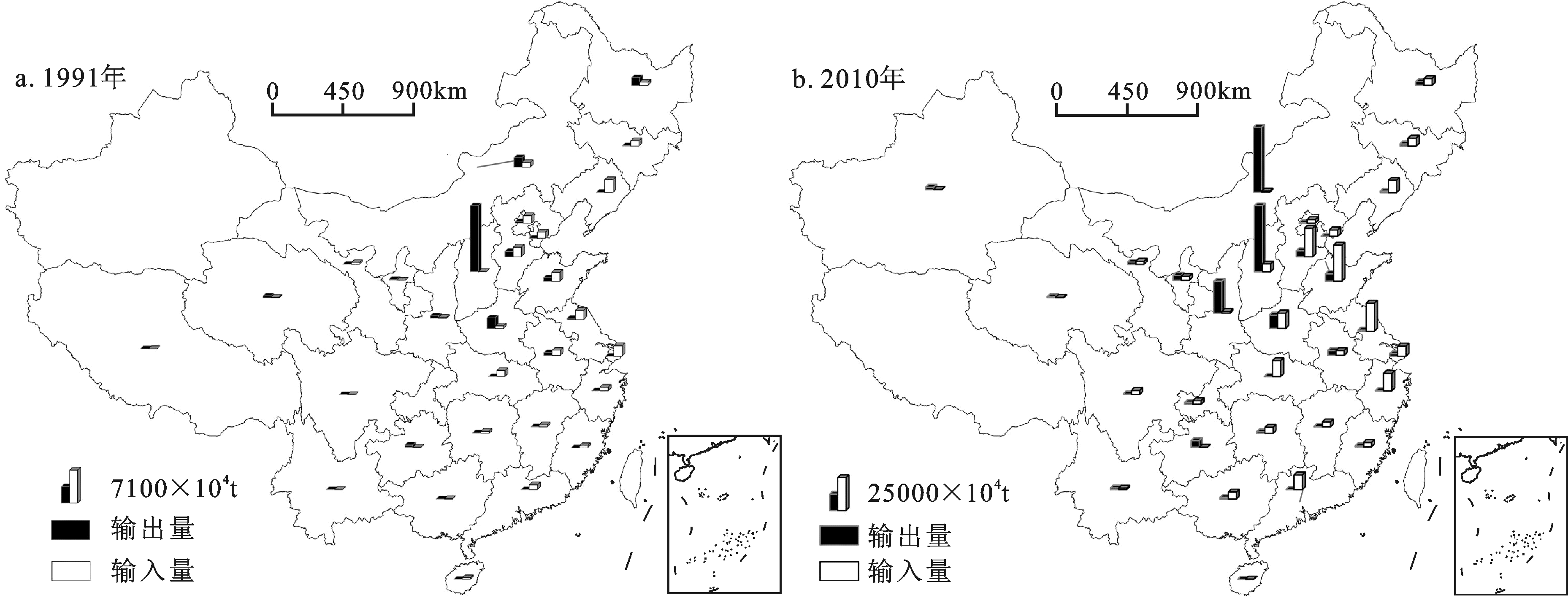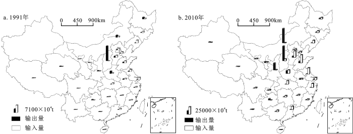 本文在从动态角度分析中国煤炭资源流源、汇地空间格局演变特征的同时,采用统计地图较为直观地从静态层面展示中国煤炭资源流源、汇地空间格局形态及其特征。根据各省份煤炭输出量和输入量(单位:104t)绘制中国煤炭资源流1991年和2010年源、汇地统计地图(图4)。