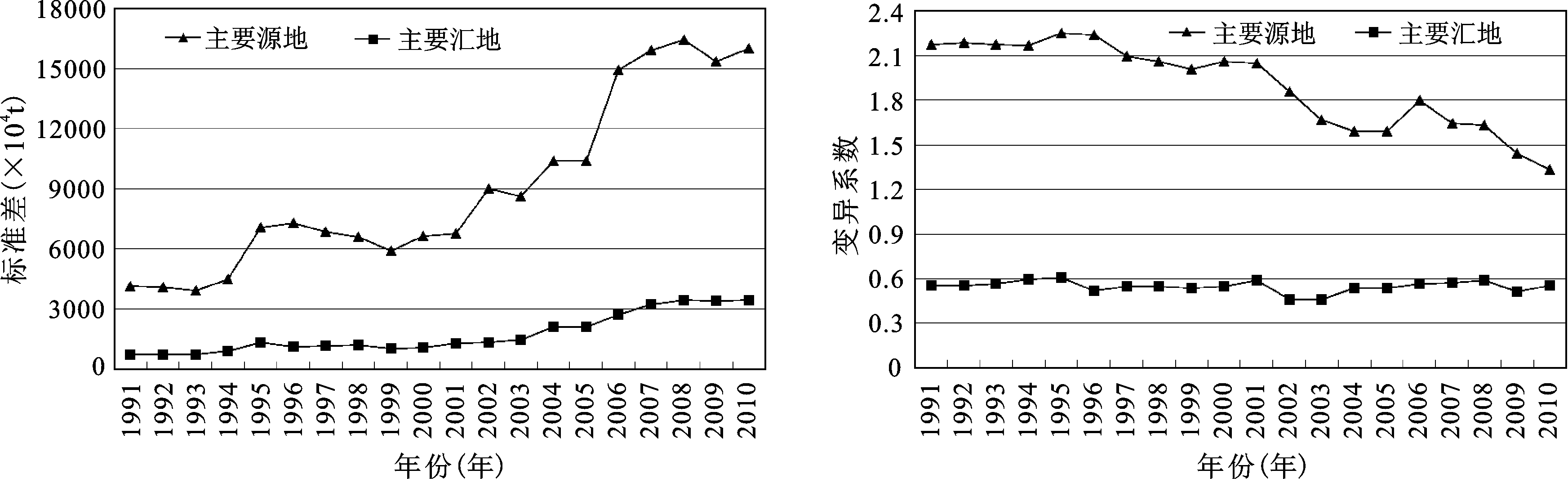 图5 主要源、汇地煤碳流量标准差和变异系数