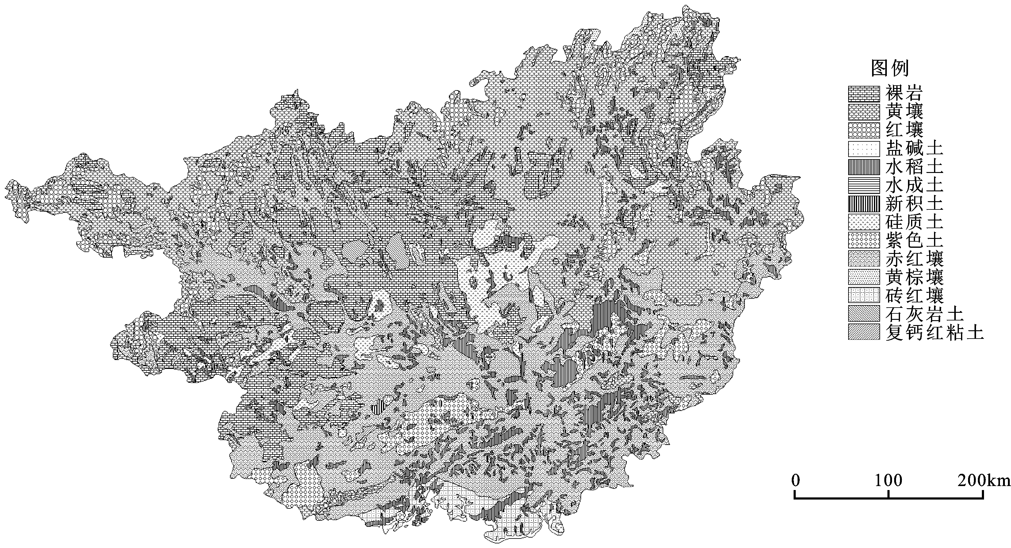 广西壮族自治区地处中国西南部,位于20°54′N~26°23′N,104°29′E~112°04′E之间,北回归线横贯中部。东连广东,东北接湖南,西北靠贵州,西邻云南,西南与越南交界,南部毗邻北部湾,与海南省隔海相望。全省土地总面积2.367×105 km2 ,占全国国土总面积的2.47%,其中碳酸盐岩分布面积占全区面积的37.8%。区域内地势自西北向东南倾斜,总体是山地丘陵型盆地地貌,桂东北猫儿山主峰海拔2 141 m,为广西第一高峰,也是南岭最高峰。区内属于热带、亚热带湿润气候,年降水量为1 080~2 760 mm,在太阳辐射、大气环流和地理环境的共同作用下,形成了热量丰富、雨热同季,降水丰沛、干湿分明,日照适中、冬少夏多,灾害频繁、旱涝突出的气候特点[42 ,49 ,51 ] 。广西土壤地带性和地域性规律比较明显,包括:红壤、黄壤、砖红壤、水稻土等共13种土壤类型(图1 )[52 ~57 ] 。