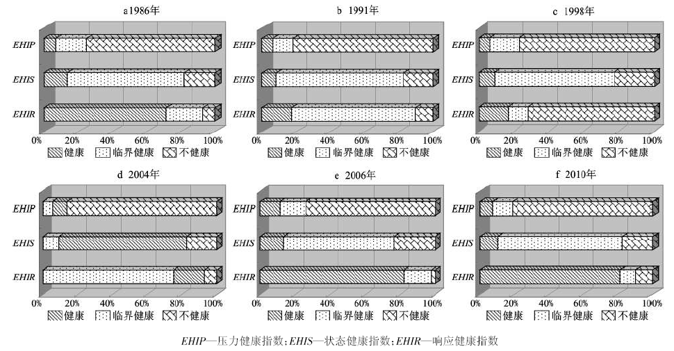 从图2和表4可知,洞庭湖健康最大隶属度和其综合健康指数的计算结果基本一致。1986年和1998年洞庭湖系统健康对3个等级的隶属度分别为[0.030,0.185,0.785]、[0.092,0.186,0.721],其健康状况对不健康的隶属度最大,依次为0.785和0.721,根据最大隶属度原则,该两典型年湖泊健康状况处于不健康水平;而湖泊健康综合指数分别为0.559和0.547,也表现为不健康。1991年洞庭湖健康状况稍好,处于临界健康水平,其隶属度为[0.114,0.671,0.215];而其湖泊健康综合指数为0.601,也表现为临界健康。三峡工程蓄水运行之后,洞庭湖系统健康状况明显有所好转,2004年、2006年和2010年洞庭湖其最大隶属度均对应临界健康状态,其对3个评判等级的隶属度分别为 [0.124,0.713,0.164]、[0.098,0.687,0.214]和[0.095,0.722,0.184];而3个典型年湖泊健康综合指数分别为0.634、0.619和0.651,也均为临界健康。同时,从各典型年看,洞庭湖综合健康指数呈现出缓慢上升的趋势。然而,各典型年中无一健康年份,说明洞庭湖健康状况不容乐观。如果不采取合理、科学、有效的整治措施针对“病因”去“治疗”,那么其健康状况将进一步恶化。