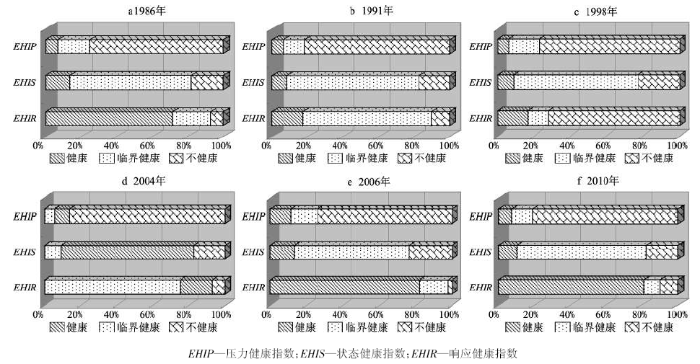 在咨询专家的基础上,结合洞庭湖现状特征,确定3个等级的洞庭湖系统综合健康指数,即健康(>0.8)、临界健康(0.6~0.8)和不健康(<0.6)。