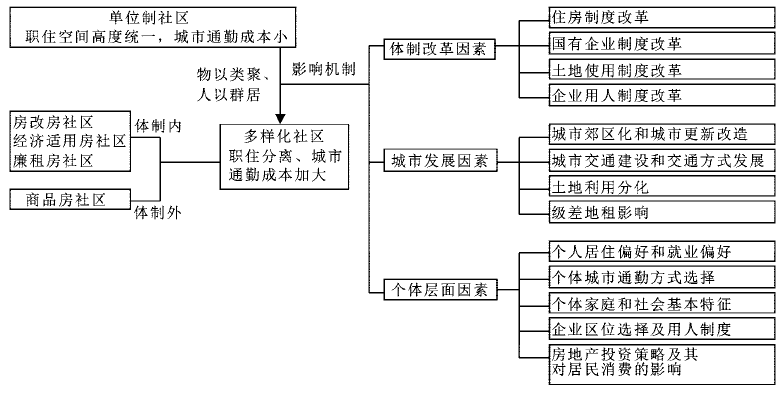 计划经济时期的中国城市单位制社区内职工的职住空间统一,城市通勤成本低。转型期城市社区向多样化社区转变,形成了体制内的房改房社区、经济适用房社区和廉租房社区等和体制外的不同层次的商品房社区,城市居民则按照“物以类聚、人以群居”的原则,按照个体特征(如家庭收入、家庭结构、职业、居住偏好等)集聚到不同类型社区中,城市居民的职住空间发生重组,城市通勤行为和成本也发生相应变化。图1归纳了城市居民职住空间和通勤行为的城市转型背景。