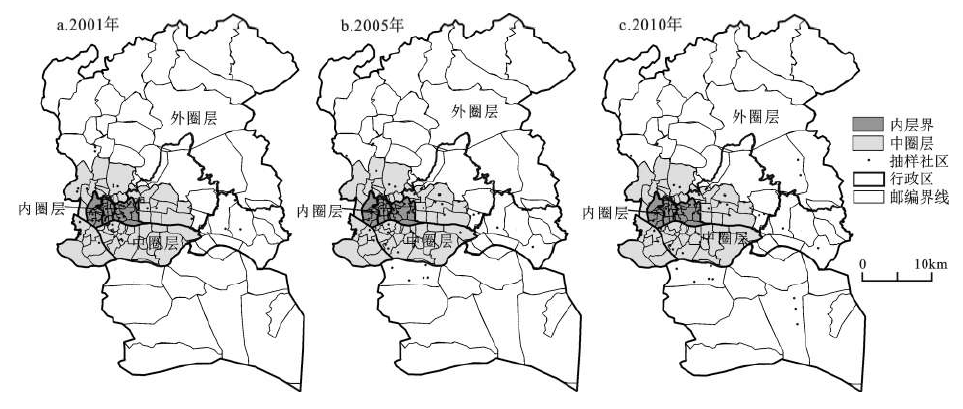 图 2 2001年、2005年和2010年抽样社区分布