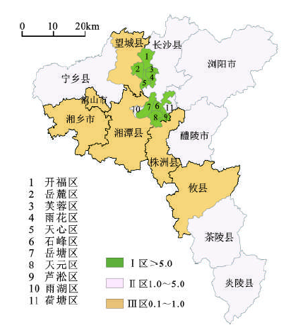 从长株潭城市群各县市区的农村居民点相对变化幅度和变化率来看,可分成3个区,Ⅰ区为>5.0;Ⅱ区为1.00~5.00;Ⅲ区为0.10~1.00。