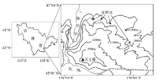 长白山北坡林线海拔为1 900~2 000 m左右[19],林线生境风大寒冷[20],岳桦由于其较强的抗寒、抗风而成为长白山森林分布的上限树种[21],同时与长白落叶松、东北赤扬(Alnusmandshurica)等少量乔木混生[22]。树线乔木层植被为岳桦纯林和岳桦-长白落叶松混交林两种类型[23],林线处岳桦以斑块状镶嵌分布于高山苔原带,并逐渐向上扩展[2,24]。研究区内林线型为岳桦-长白落叶松混交林,长白落叶松除正常生长形态外,一些树木的生长形态出现变化,如旗形树,即树木的一侧枝叶完全消失,只在另外对应一侧生长,使树木的外形呈现旗形。另外一种变形是主干没有长成,而是一些支干在地面呈现匍匐生长状态,在外貌显示垫状形态。取样区地理位置为42°2′27″N~ 42°3′14″ N,128°4′35″E~ 128°5′53″ E,是长白山森林-苔原过渡带典型地段(图 1)。
