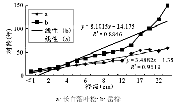 图 3 长白落叶松和岳桦的树龄-径级曲线
