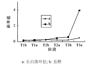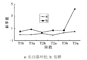 在正常形态长白落叶松的样地内,不同时期的岳桦径级结构的趋势线斜率呈波状增加,但波动幅度比较小,几乎一直保持增加的态势(表 4,图 9)。长白落叶松也保持增加态势,但是增幅明显小于岳桦,表明受到岳桦种群膨胀的极大挤压。仅在第一个高温期长白落叶松扩张占有优势,在第一个高温期末岳桦扩张的能力就超过长白落叶松,在第二个高温期前虽然长白落叶松扩张能力与岳桦相似,但是在第二高温期后岳桦扩张的能力则明显超过长白落叶松,而且差距越来越大(表 4,图 9)。这个对比差异显示在林线海拔较低处,虽然长白落叶松拥有较强的竞争力,但是由于在幼苗阶段处于弱势,使其在岳桦扩张持续的压力下无以显现。种群虽然也保持膨胀态势,可是明显受制于岳桦的挤压,尤其在海拔较低,气温相对较高,环境更适宜的地方。