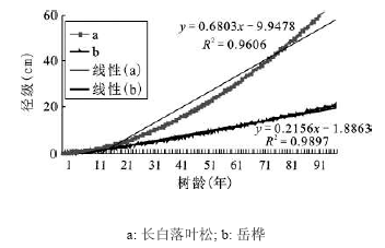 图 2 长白落叶松和岳桦的径级-年龄生长曲线