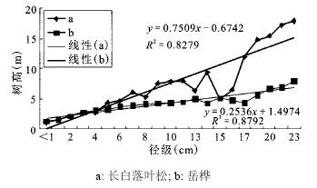 图 4 长白落叶松和岳桦径级(胸径)-树高生长曲线