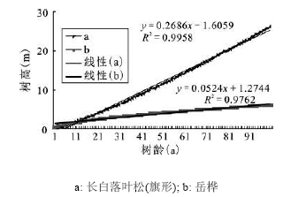 图 5 长白落叶松和岳桦树龄-树高曲线