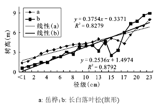 图 6 长白落叶松(旗形)和岳桦径级(胸径)-树高生长曲线