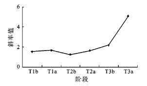 在垫状长白落叶松的样地内,由于垫状落叶松无法确定年龄,只分析岳桦径级结构的变化,不同时期的岳桦径级结构的趋势线斜率呈波状增加,从每一个高温期斜率前后对比来看,高温期后都比高温期前大(表 4,图 7),说明每一个高温期都是种群扩张积极的时期。从几个高温期的斜率增加值看一次比一次大[(0.114 3(KT1a-KT1b)<0.387 9(KT2a-KT2b)<2.900 2(KT3a-KT3b)],与高温期增温幅度逐渐加大的趋势相吻合[33]。不同时期斜率的对比变化进一步证明岳桦种群对气温变化响应明显,气温升高促使岳桦种群不断扩张且与升温幅度密切相连。