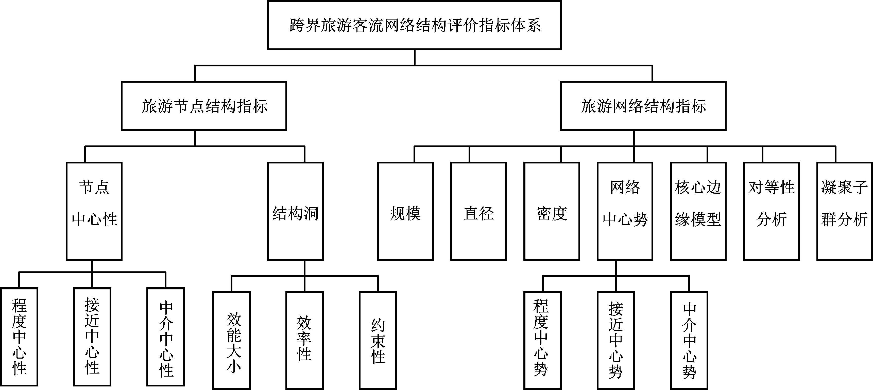 在社会网分析指标基础上,结合跨界旅游客流网络特征,构建跨界旅游客流网络结构评价指标体系(图1 )。包括旅游节点结构和旅游网络结构两个方面。其中旅游节点结构评价指标包括中心性指标和结构洞指标(旅游网络中,网络稀疏区存在旅游节点的联系断裂现象,被称为“结构洞”),分别反映旅游节点在旅游网络中的中心性和区位优势。旅游网络结构评价指标包括规模、直径、密度、网络中心势、核心边缘模型、对等性分析和凝聚子群分析等,重点测度整体或局域旅游网络结构属性。