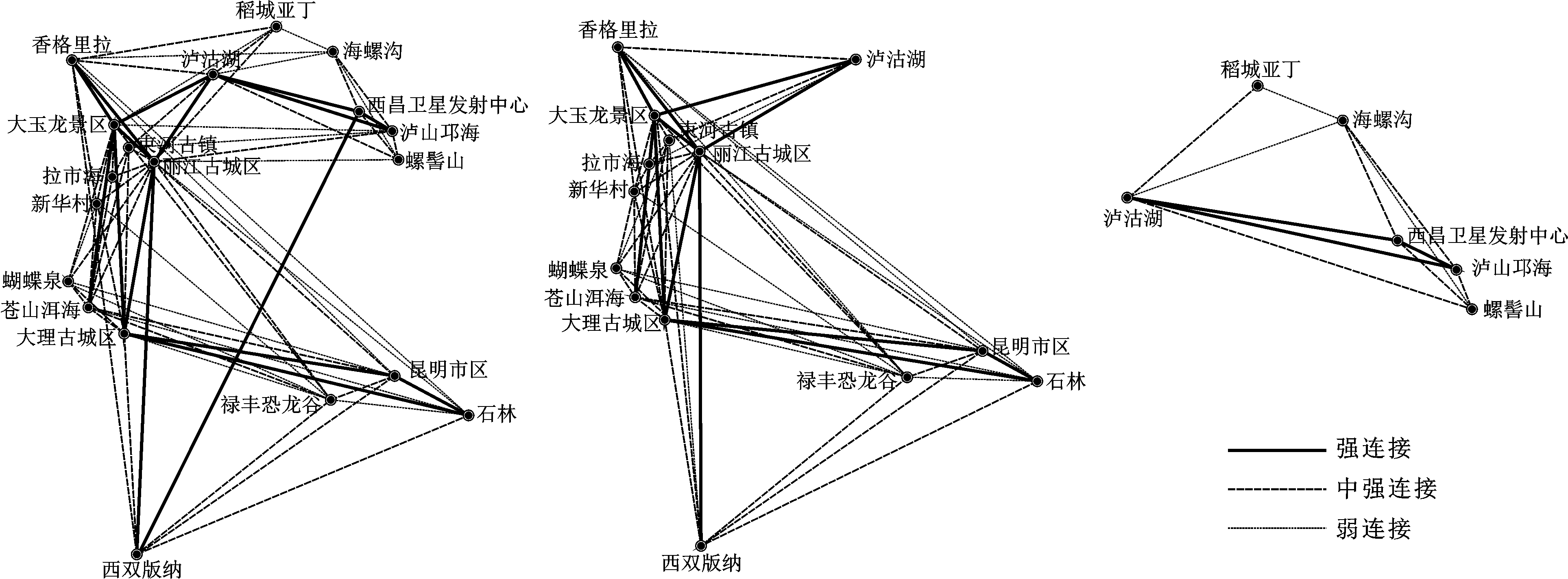 问卷分析发现,泸沽湖跨界旅游者主要由昆明、丽江和西昌3地集散,占92.14%,与游客访谈结果一致。由旅游客流网络各旅游节点中心性指标(表2 )可知,泸沽湖跨界旅游者主要选择较高级别和较好通达性的旅游地。丽江古城区、大玉龙景区两处程度中心性和接近中心性指标处于极高值,是泸沽湖跨界旅游客流网络的核心和集散中心,两地旅游资源禀赋高,加之交通与区位具有比较优势,对云南和四川两片区旅游者均具有较强吸引力。泸沽湖、香格里拉在泸沽湖跨界旅游客流网络中处于次级旅游核心、发挥次级集散中心功能,对其他旅游节点客流具有较强支配性。其中,泸沽湖景区地跨川滇两省,在旅游资源空间结构和旅行社线路组织方面具有先天中介优势,中介中心性为12.05;香格里拉距离泸沽湖相对较近,是云南重要旅游目的地,也是重要的旅游集散中心,其航空港口与昆明、西双版纳等旅游地和重庆、成都等主要客源市场联系紧密,中介中心性为9.95。大理古城区、苍山洱海、昆明市区、束河古镇等地中心性指标均较高,是云南昆明- 大理- 丽江经典旅游线路中重要的旅游目的地和旅游通道,云南片区旅游者线路组合多包含这些节点。泸山邛海是四川片区客流进入泸沽湖的重要旅游地,起中介作用,成为泸沽湖跨界旅游客流网络中唯一位于四川的次级集散中心和重要目的地,应强化两地各层级旅游合作、产品开发和线路整合。恐龙谷、新华村、蝴蝶泉、石林和西双版纳等地作为一般旅游目的地,旅游客流联系主要发生在昆明、大理、丽江和西双版纳,对跨界旅游客流网络介入机会较小,需加强其旅游产品宣传力度,走差异化开发路径。拉市海作为湖泊旅游目的地,受泸沽湖屏蔽效应影响客流较少,西昌卫星发射中心、螺髻山和稻城亚丁等地处四川西南边缘,与省内及云南核心旅游节点相距较远,成为跨界旅游客流网络中的边缘旅游地。