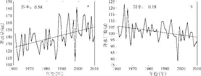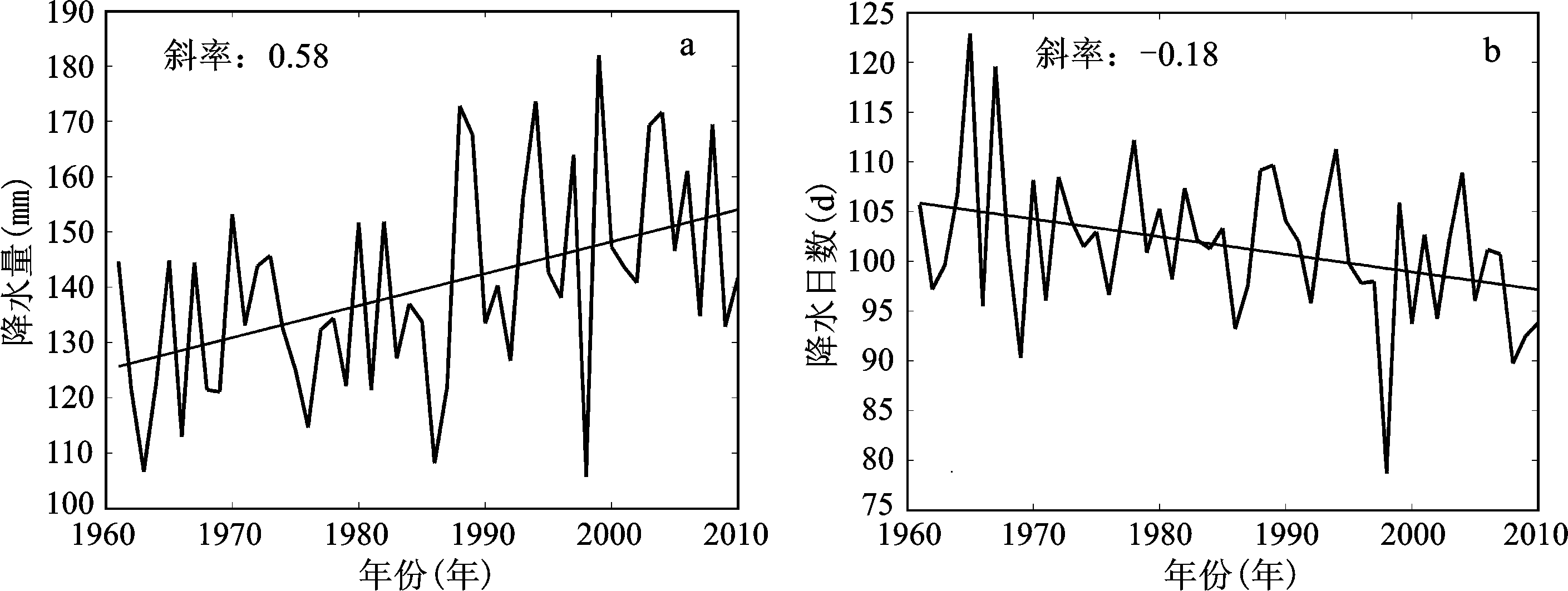 1) 降水量和湿日数的总体变化。由分析结果图1a表明,在过去半个世纪里,西北干旱区的降水变化趋势为增加态势,Z值为3.53(α<0.01),说明增加极其显著。多年平均降水量150.1 mm,最高年降水量180 mm发生在2001年,比年平均高出30.1 mm;最低降水量是1987年的108.5 mm,比年平均降水低41.5 mm。最高与最低降水的差值高达72 mm。过去51 a里,年降水总量总体上增加30 mm,增加的速率为 5.8 mm/10 a;降水日数变化的Z值为-2.1(α<0.05),说明下降显著(图1b)。多年平均降水日数为97 d,降水日数最高是1964年的123 d,比年平均高出了26 d,最低是1998年的78 d,比年平均低19 d。年降水日数总体减少10 d,减少的速率为1.8 d/10 a。分析发现,研究区年降水的总量在显著增加,而降水日数却明显减少,这证明降水强度在增加。