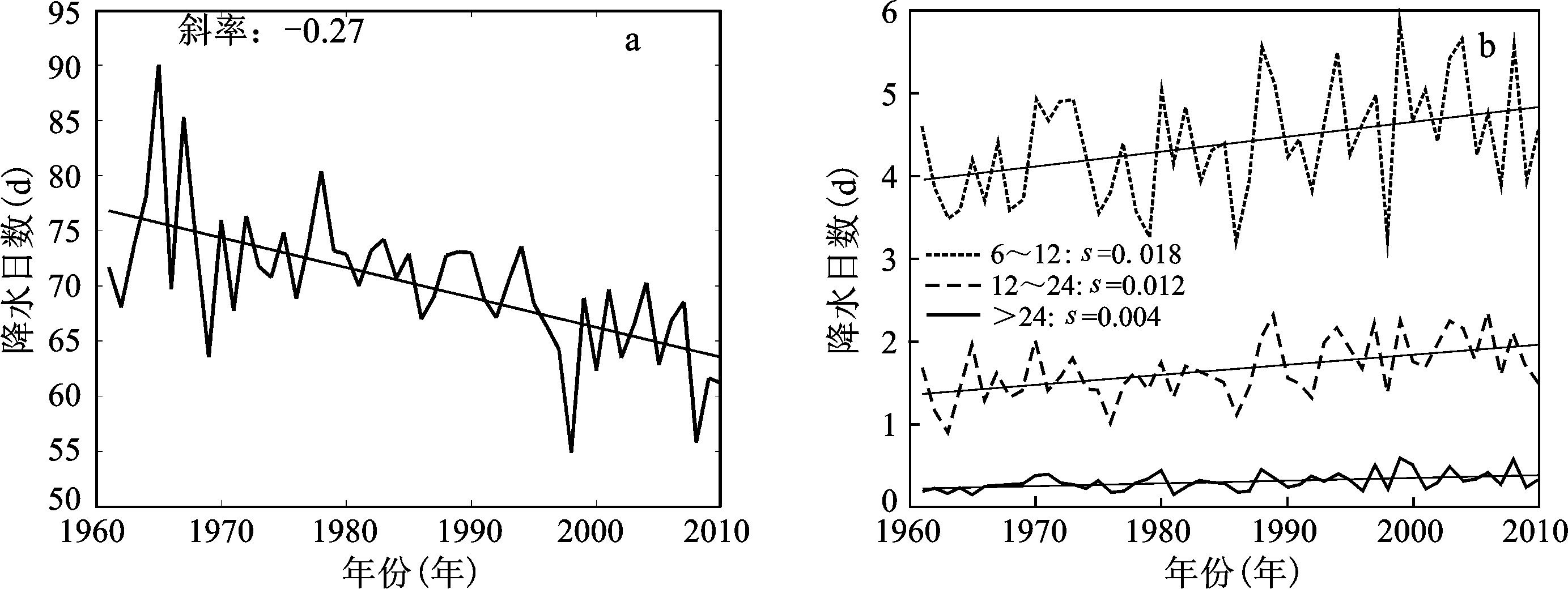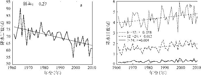 Fig.2 Precipitation days of 0.1-6 mm(a) and days of precipitation(6-12 mm,12-24 mm,>24 mm)(b)
