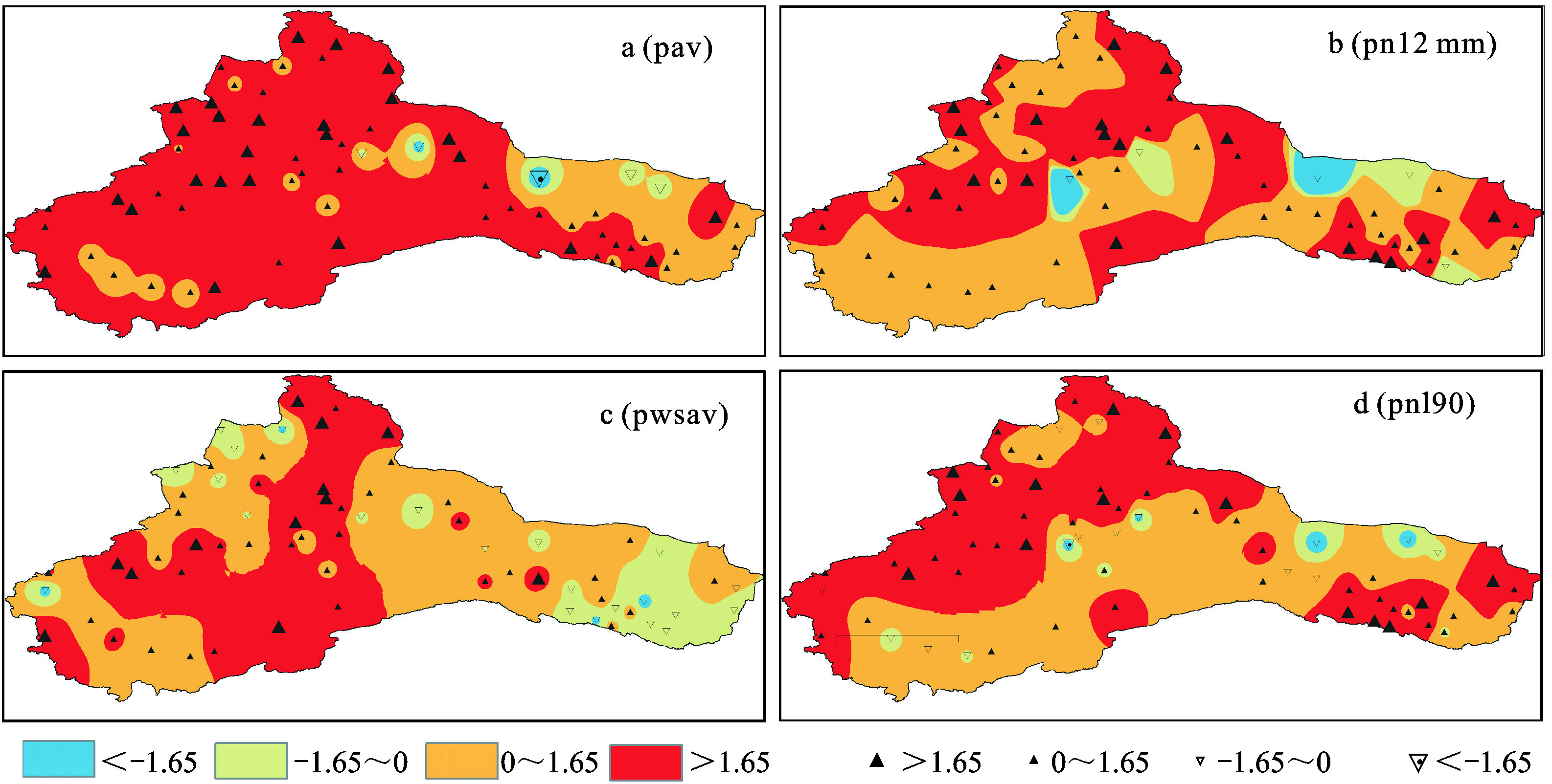 选取平均降水(pav),大于12 mm的强降水(pn12 mm),连续湿日平均值(pwsav),日降水量大于湿日90%分位点降水量的日数(pnl90)指标,从图中可以看出:平均降水大部分是增加的趋势(图3a),且都通过了显著性检验(α≤0.1),只有在贺兰山西端,Z值为1.2,呈现微弱增加趋势。年降水量超过12 mm的强降水在天山的南、北坡和塔城地区呈现极强的增加态势(图3b),Z值达到1.65上。而在昆仑山北坡和阿拉山风口虽然也表现出增加的趋势,但不明显。同时还显示,研究区湿日连续日数在阿勒泰山,天山南坡和昆仑山东端北坡表现最为明显(图3c)。而日降水量大于湿日降水量90%的日数增加区域主要分布在研究区的西北 (图3d)。研究区总体上变化趋势表现为降水和强降水空间分布一致性高,且强降水主要集中在除昆仑山北坡外的高山区域。