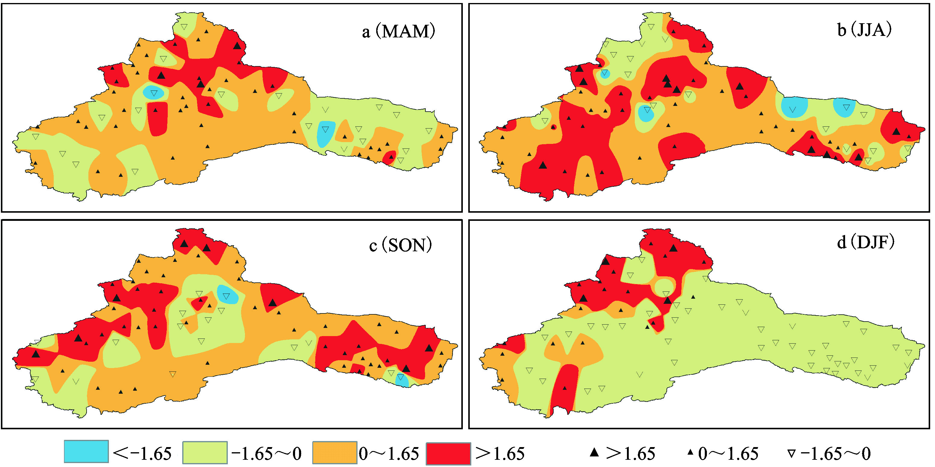 2) 强降水(>12 mm)空间分布。图4可见,夏季降水增加主要在昆仑山北坡东端(图4b),Z值都超过了1.65,而阿拉山风口一带和河西走廊北部,Z值为-0.8,说明强降水有微弱减少趋势;冬季降水增加显著区在阿尔泰和伊犁地区(图4d),Z值达到2.1,而天山以南和广阔的河西走廊则有微弱的减少趋势,平均Z值为-0.9,这说明,在冬季,强降水只有新疆北部增加明显。春季和秋季强降水在空间上呈现相反的趋势(图4a、c)。比如在春季河西走廊(天山南坡)强降水微弱减少(增加)趋势,而在秋季则呈现出微弱增加(减少)趋势。