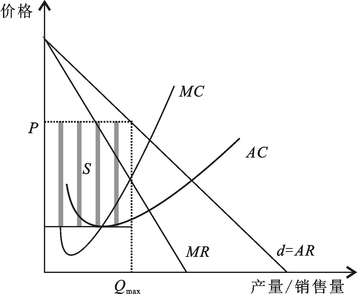 边际成本曲线MC和平均成本曲线AC最初会随产量增加而有小幅下降;但随着产量的增加,劳动的边际收益递减规律发生作用,劳动的边际产量开始降低,此时MC和AC随产量的增加而上升。企业利润最大化的产量Qmax由MC=MR时的点决定,此时的产量所对应的市场价格为P,垄断利润为(P-AC)Qmax,即图1中阴影部分S。