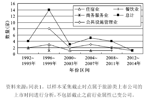 旅游上市公司时间维度呈现间隙性缓慢发展特征。住宿餐饮业上市早、停滞时间长,行业归属变化大;旅游商务服务业间隙时间长,总量少,旅游公共设施管理业井喷后缓慢延续,行业归属较稳定。