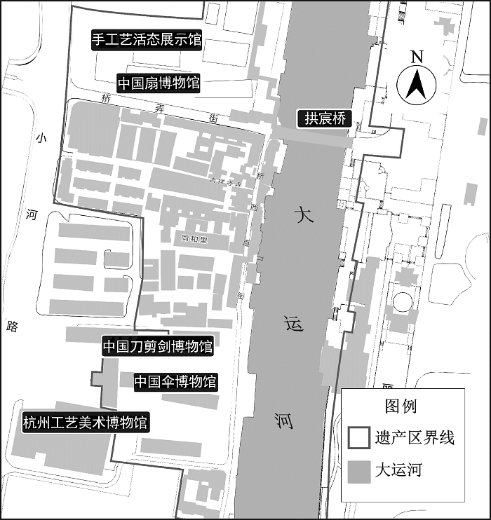 根据空间分布形式,工业遗产可分为基元型工业遗产和集落型工业遗产。前者指历史工业建筑、构筑物与工业景观要素、工业设施等,强调个体要素。后者即通常所谓的历史风貌区,包括历史工业建筑(构筑)物、工业景观设施、场地空间肌理、活动事件等,强调的是场所的集合[7]。本文所关注的杭州运河拱宸桥西区域集聚了自清末至新中国成立后陆续新建的工厂车间、码头仓库等工业遗产,体量较大、风貌完整,属于典型的集落型工业遗产。