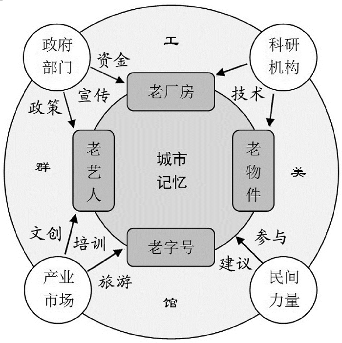 “双层模式”的外层为城市记忆延续的保障要素层,主要包括:一、政府部门。提供相关政策、专项资金和对外宣传等公共职能。二、科研机构。提供旧建筑保护、文物考古、旅游策划、展陈设计等专业技术和智囊参考。三、民间个体或行业协会。提供行业渠道、藏品文物和意见建议、舆论监督等。四、产业市场。提供休闲旅游、文化创意和技艺培训等市场需求。
