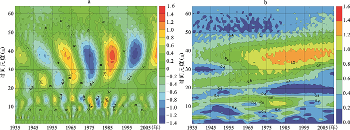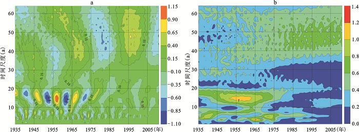 ... 图2 是借助Surfer8.0通过插值绘制的渭河华县站年径流量变化的小波系数实部及小波系数模等值线图,图中横坐标为时域尺度,纵坐标为频域尺度.小波系数实部等值线图反映了序列在不同时间尺度的周期变化及其时域分布,并能反映出时间序列的变化趋势,实线说明小波系数为正,表明该时期径流偏丰,零值对应突变点,虚线说明小波系数为负,表明该时段径流偏枯[19 ] .图2 a变化显示渭河径流量存在如下4类周期变化:35-41 a尺度,以38 a为震荡中心,径流出现丰枯交替的准4次震荡;21-27 a尺度,嵌套于35-41 a大尺度变化,震荡中心为24 a,径流出现丰枯交替的准2次震荡,20世纪 60年代之后该周期变化逐渐消失;10-15 a尺度,以12 a为震荡中心,径流出现丰枯交替的准8次震荡.该周期变化主要活跃于1945-1995年,其中1975-1985年该周期变化强度较大,在20世纪60年代该震荡中心下移并分化成为2个小的震荡中心;3-5 a尺度,以4 a为震荡中心,径流出现数次小尺度丰枯交替准震荡,该周期变化在20世纪30年代、40年代及60年代较强,其它年代较弱,20世纪60年代之后趋于消失.小波系数模等值线反映不同周期对应的能量密度时域分布情况,模值愈大其所对应时段的周期性愈强,图2 b中35-41 a的周期变化最为明显,具有全域性,10-15 a的周期变化次之,仅覆盖于1945-1995年. ...
