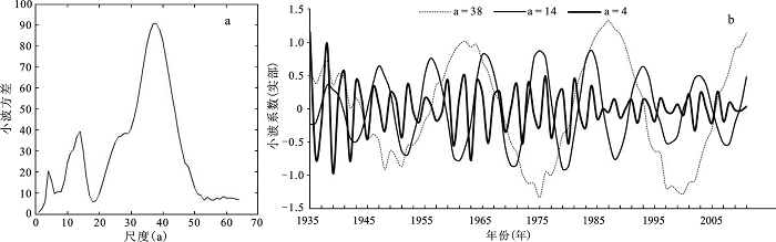 小波方差反映了信号波动能量随时间尺度的分布状况,可根据频域上的方差贡献值检验径流序列的主周期。小波方差分析结果显示渭河径流量变化的主周期依次为38 a、14 a、4 a (见图3 a)。依据方差确定的主周期绘制出的渭河径流量小波系数过程线如图3 b所示。