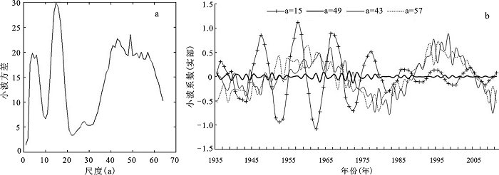图3 渭河径流量标准化序列的小波方差(a)及主周期不同时间尺度小波实部过程线(b)