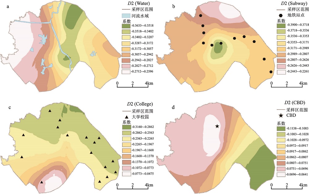 两类模型结果表明,距地铁站点、水域、大学园区以及CBD的距离是研究区住宅地价变化的关键驱动因素,其中,最为核心的2类要素为地铁站点、水域,其对居住用地价格的边际贡献位于前列。利用GIS表面分析功能(Surface Analysis),将GWR模型输出的各地价样点局部参数估计值进行反距离权重插值,见图2。