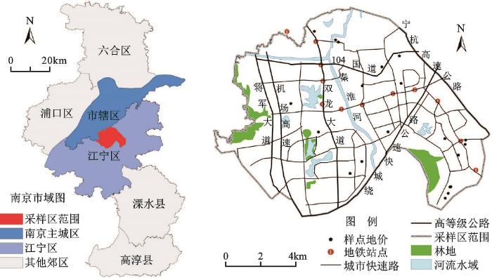近年来,国外学者应用空间扩展模型与地理加权回归 (Geographically Weighted Regression, GWR) 模型开展关于房地产市场异质性的研究。Fik等构建二阶空间扩展模型模拟研究区住宅市场影响因素的变化特征,发现扩展模型的解释能力远胜于特征价格模型,有力地证明了住宅市场空间异质性的存在 [8];Yates 和Farber研究发现较之全局回归模型,GWR模型能解释研究区90%的住宅价格变化 [9] ;Bitter等发现上述两类模型均能有效探索该区域房地产市场的空间异质性问题,且GWR模型的拟合效果与预测准确率均高于空间扩展模型 [10] ;Gao等也进行了几种回归模型的实证分析[11]。房地产市场空间异质性的研究也逐渐受到国内部分学者的重视,如吕萍[12]、曾晖[13]、汤庆园 [14] 、董冠鹏[15]等分别借助GWR模型和空间扩展模型对房地产市场进行分析,探究房地价格的空间分布规律及其驱动因素,并对其空间异质性进行模拟与预测。然而,已有研究以住宅市场为主,土地市场为辅,且不同计量模型在刻画房地产价格影响因素空间分异准确性方面的对比研究较为鲜见。另外,当前研究地域主要关注社会经济发达、城市建设密集的中心城市区域,而对城市用地快速增长,土地市场逐渐活跃的都市新区有所忽视。本文以都市新区的南京市江宁区为例,构建空间扩展模型与GWR模型进行对比分析,以期深刻理解都市新区住宅土地市场空间异质性的驱动机理,从方法和实践上充实土地经济学的研究案例,同时可为类似地区土地管理工作提供有益借鉴。